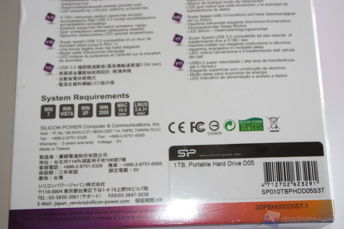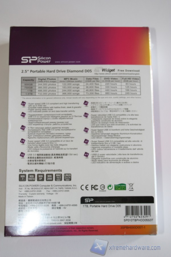 Ora, passando al retro, troviamo in alto una tabella dei modelli disponibili per la serie Diamond di Silicon Power, che parte da 500 GB fino ad arrivare ad 1 TB (il prodotto che stiamo recensendo) e le relative possibilità di storage per i vari modelli con file ad esempio in formato MP3, foto JPEG, DVD video, file di altro genere e video in formato Full HD. Andando più giù troviamo le caratteristiche generali del prodotto in ben 10 lingue tra cui l'Italiano. Infine troviamo i requisiti di sistema e le informazioni relative all'azienda.
